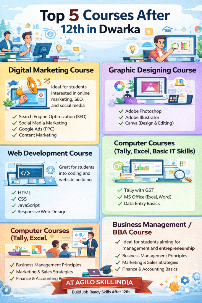 This blog is specially created for students and parents searching for the top 5 courses after 12th in Dwarka. It also naturally helps readers understand why AGILO SKILL INDIA is a strong choice for practical training. The goal is not just to list course names, but to explain what makes these courses valuable, who should choose them, what skills they build, and how they can shape a student’s future in the real world.